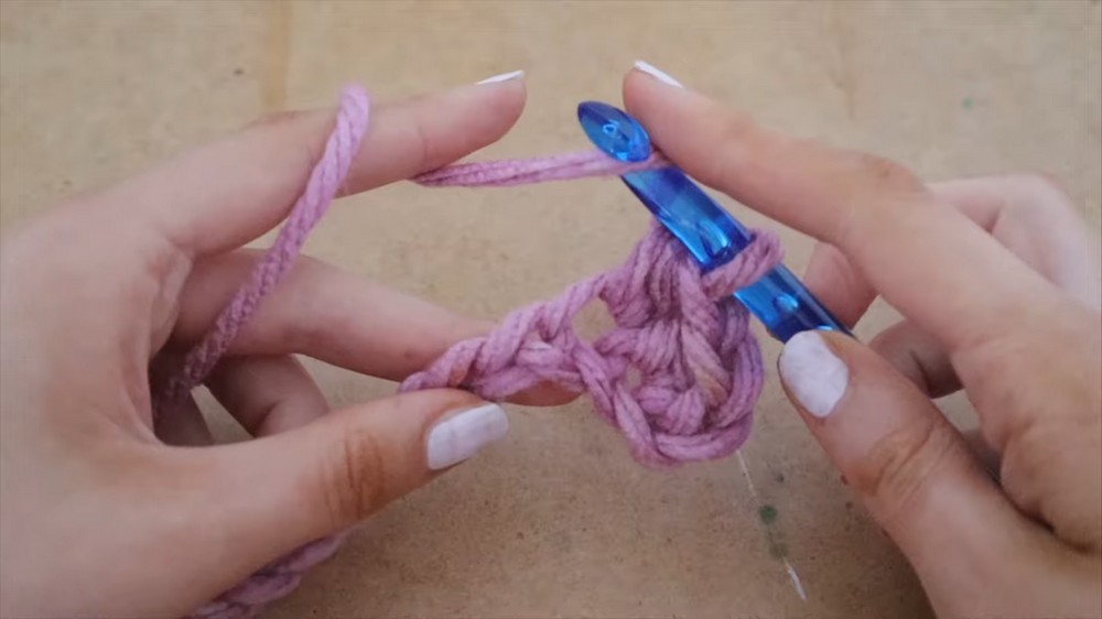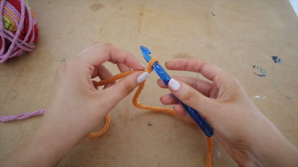 - Face your hook downwards towards the ground, hook beside the yarn, and pull it up counterclockwise through the loop to make your first chain.