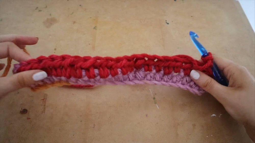 - Weave in the yarn ends by inserting your hook through the last row stitches and pulling the yarn through. Repeat 4-5 times in one direction and then back in the opposite direction.