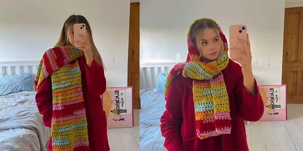 - The scarf is now complete and ready to be worn. You can style it around your neck or head if it’s rainy.