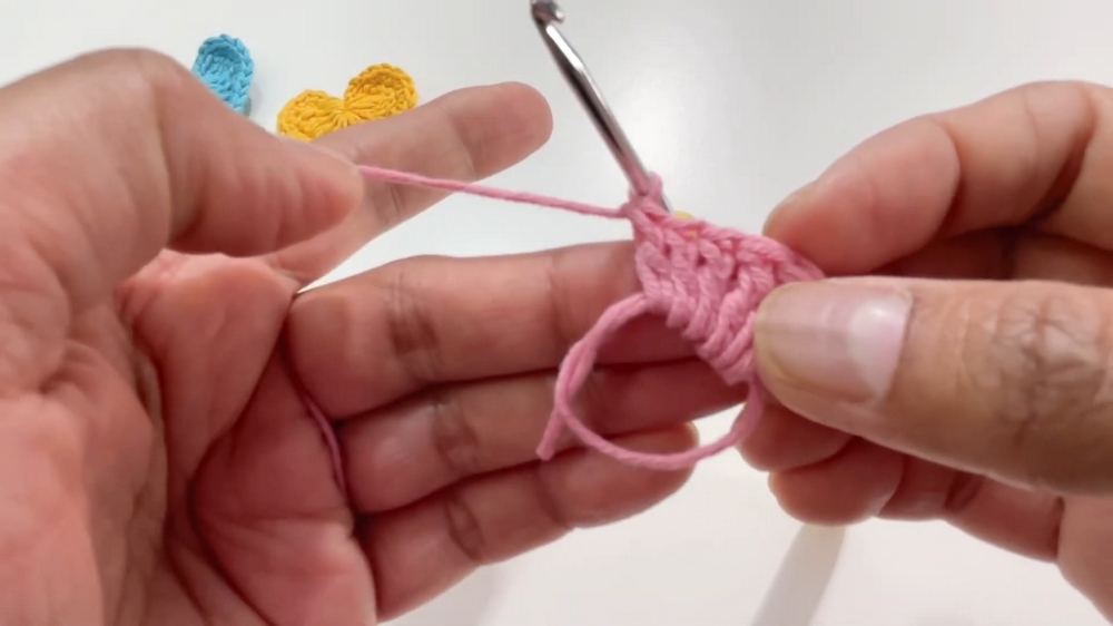 - Pull the loose end of the magic circle firmly to tighten the heart and bring the stitches together. Ensure the loops are neatly closed.
