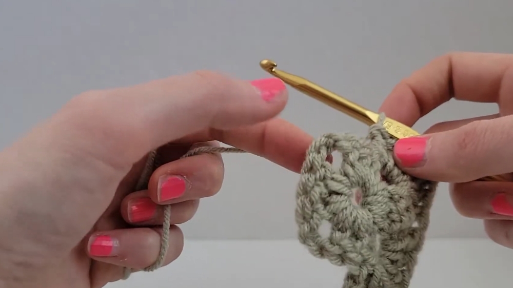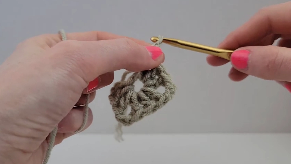 - Repeat the pattern (3 double crochets, chain 2) three more times until you have a square with 4 corners.
