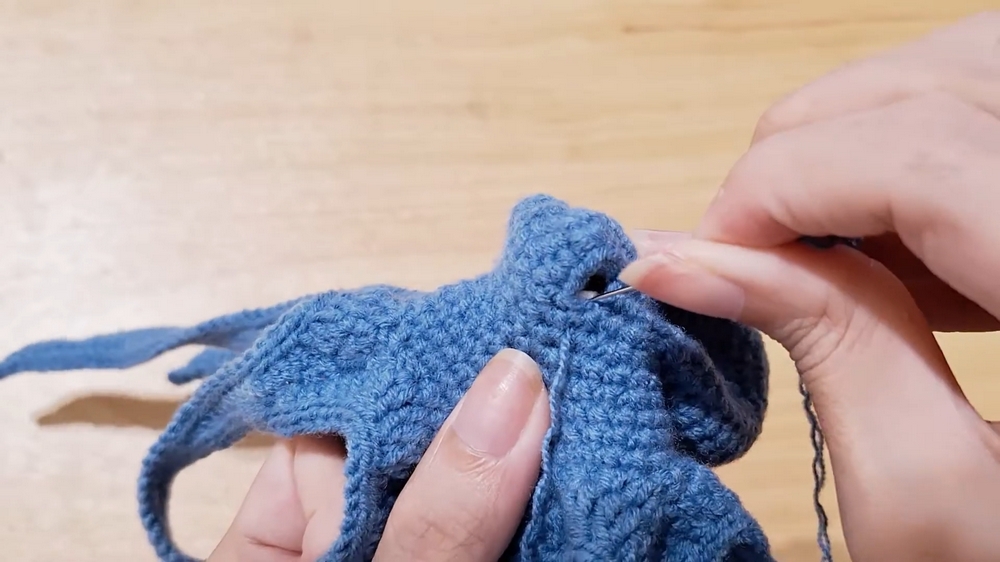 The process begins with the octopus’s rounded head, stitched precisely to maintain a delicate balance between structure and softness. Eyes are carefully placed to give a lifelike appearance, and the addition of a subtle funnel completes the head’s realistic allure.