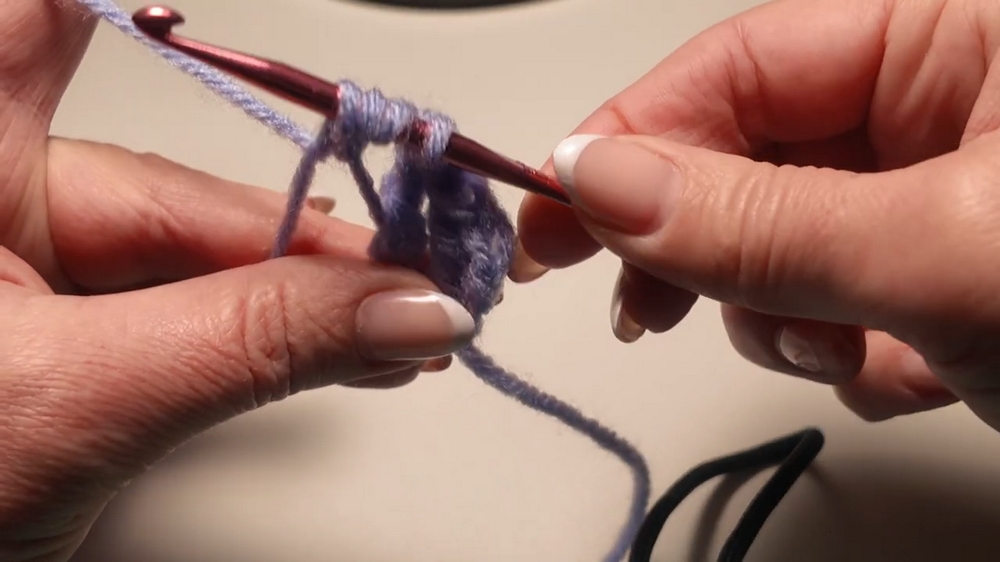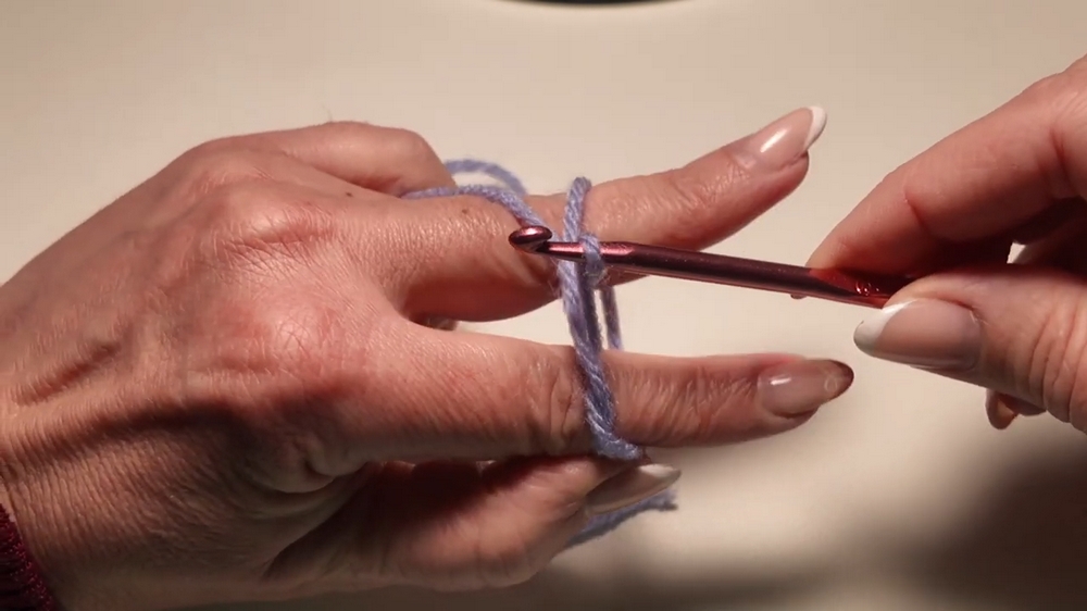- Hold the yarn in place with your pinky, insert your crochet hook under the first strand, and grab the second strand.