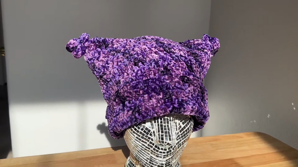 - The beanie includes small "cat ears" made from crocheted floral-like petals, giving it a playful and whimsical look.