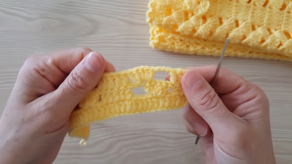 Engaging with the texture, the tutorial crafts a sequence of clusters made from five double crochets stitched into the same foundational chain, interspersed with chain-3 spaces to compose the rose designs.