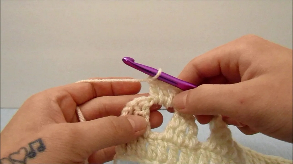 - Row 3: Double crochet (DC) across the row, starting with a chain 3. Place 3 double crochets into every chain-3 space.