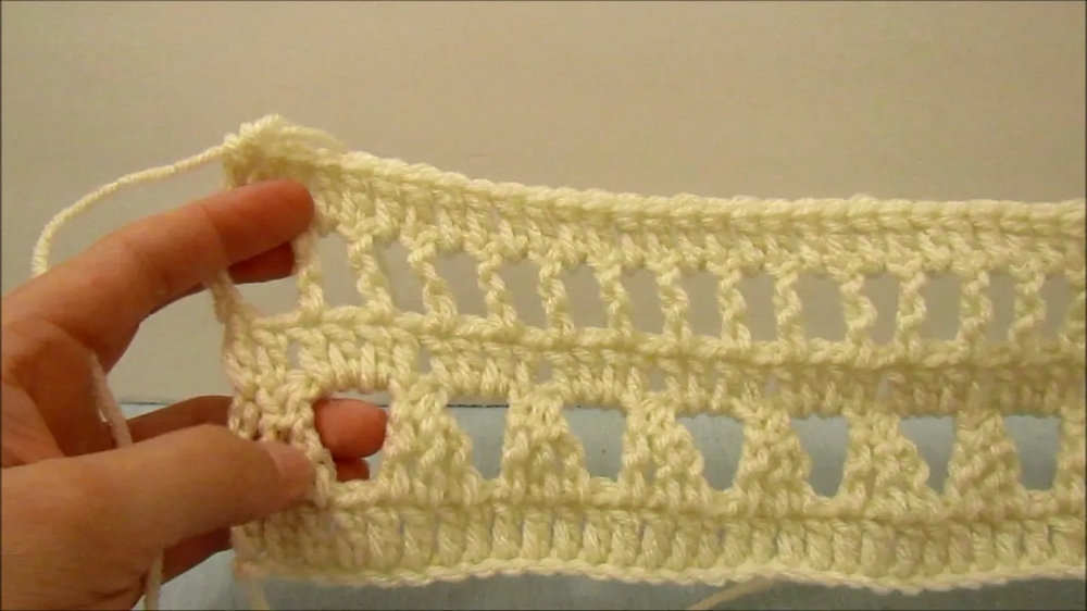 - Row 4: Start with a chain 5, skip the next stitch, and triple crochet into the next stitch. Chain 1, skip a stitch, and repeat.