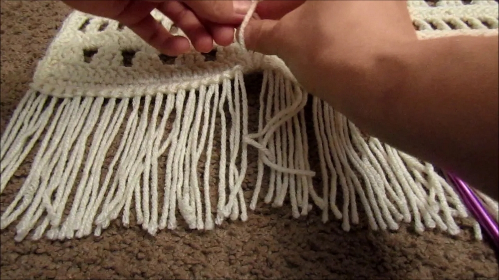 - Cut yarn pieces twice the desired fringe length. Fold the pieces in half and attach them to the bottom edge of the vest in each stitch. Keep the fringe even for a polished look.