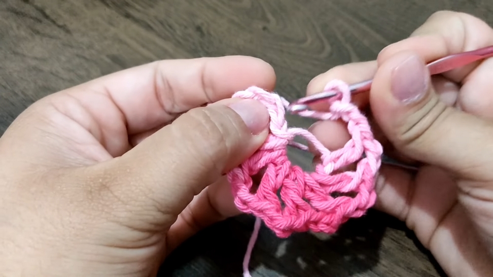 - Create eight double crochets, separated by two chain stitches (this forms the flower’s petals).