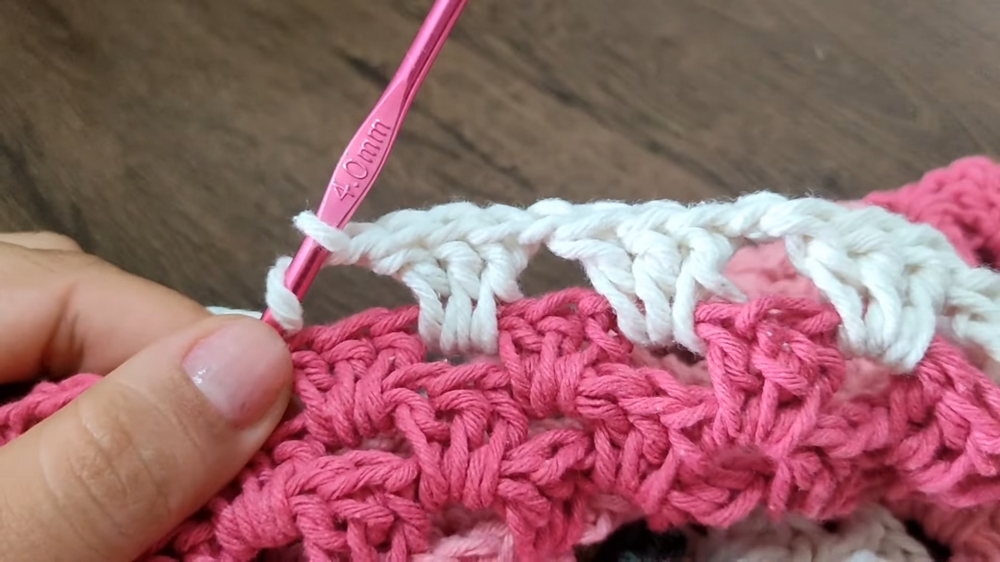 - Add three rows of ecru-colored fans, followed by three rows of light pink, and five rows of deep pink to complete the rug’s gradient design.