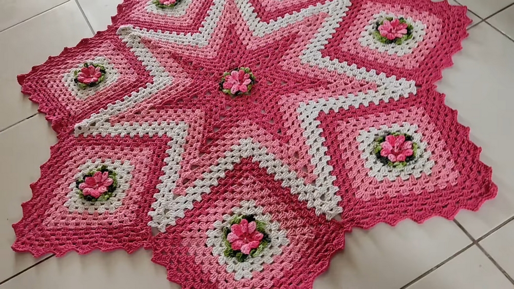The round star-shaped crochet rug combines timeless elegance with functional design, making it a truly standout addition to any space. With its vivid colors, intricate floral details, and subtle leaf accents, this rug is both rewarding to make and delightful to display.