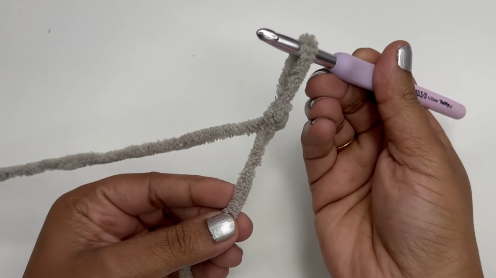 - Wrap yarn around your finger, cross it over, and form the loop. Insert your 6.5 mm hook and tighten the slip knot appropriately (not too loose or tight).
