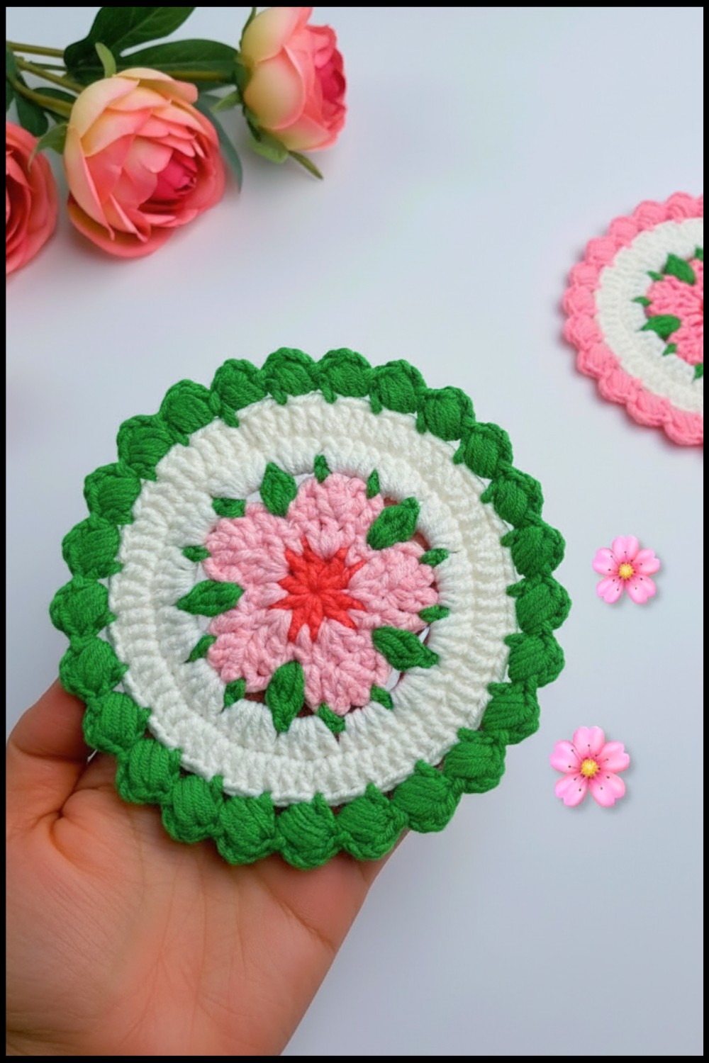 You have completed a charming cherry blossom coaster featuring layered petal details and a crisp, puffy border. This project can be made in various colors to suit any decor.