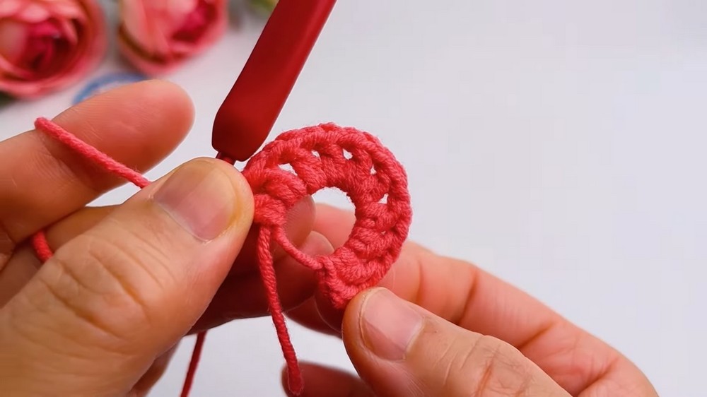 - (Dc in ring, ch 1) rep 8 more times (total: 9 dc and 9 ch-1 spaces counting the beginning ch 3 as dc).