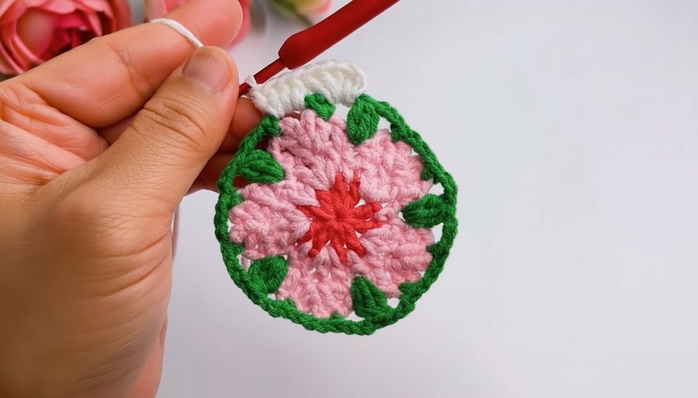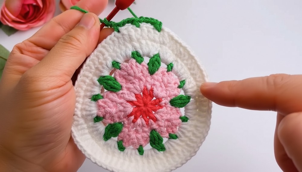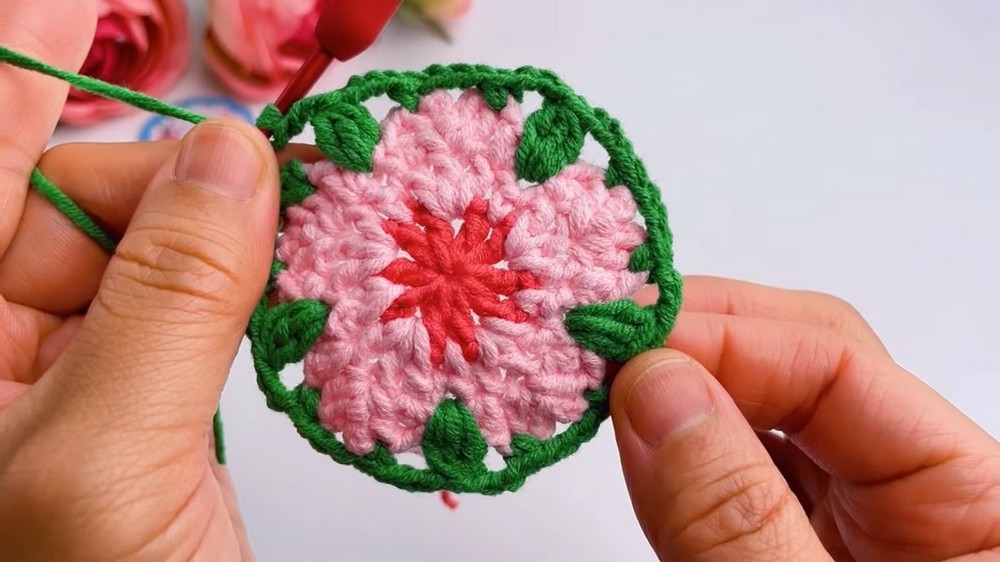 A tiny flower resting on a table and bringing a soft touch of charm to any room as you enjoy tea or a cool drink. This pretty pink blossom with a green leaf looks just like a real cherry flower and makes a coaster that feels special under a cup or glass. With a crochet cherry blossom coaster pattern a home can start to bloom with color and beauty even on the simplest days.