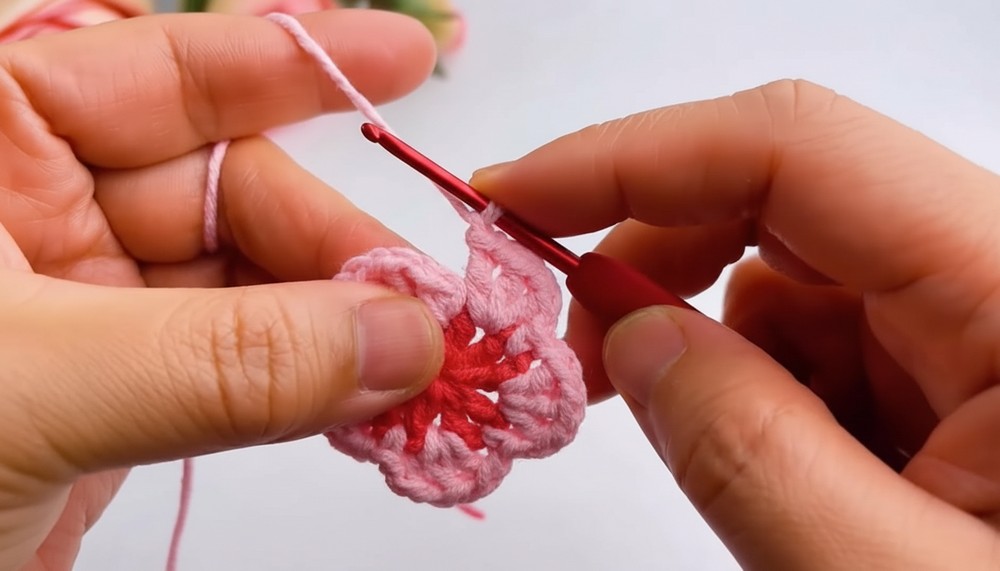 - Rep above petal pattern 4 more times around (for a total of 5 petals).