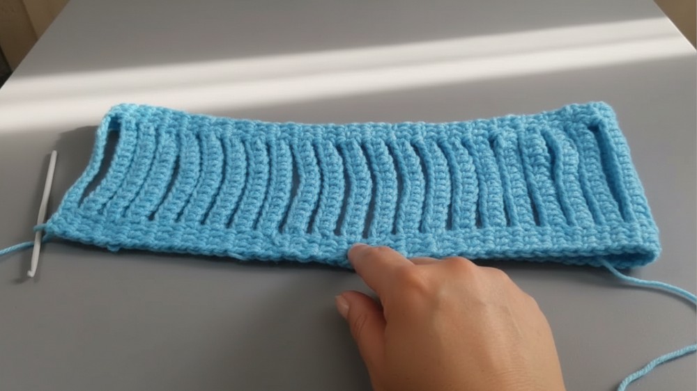 - Repeat Row 4 for each strip, adding chains for loops each time.