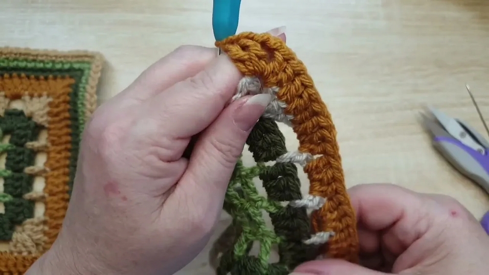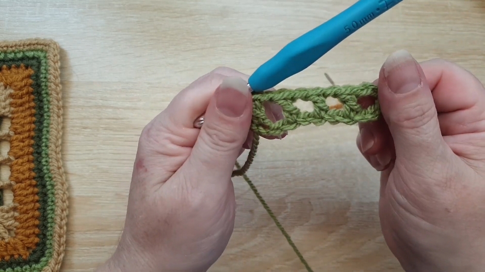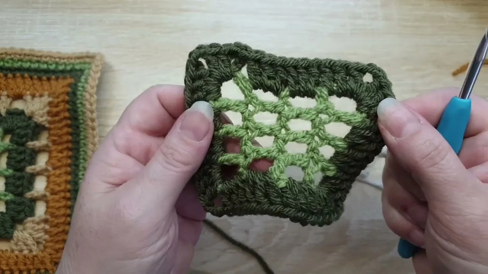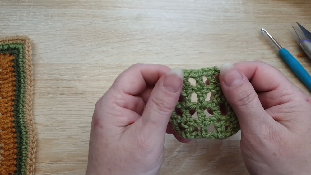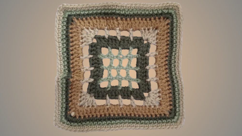 The repeating rows of trebles and chains layer neatly, creating a balanced and structured core. As the project evolves, the square transitions from simple rows to working in the round, where corners are crocheted using groups of trebles separated by chain spaces.