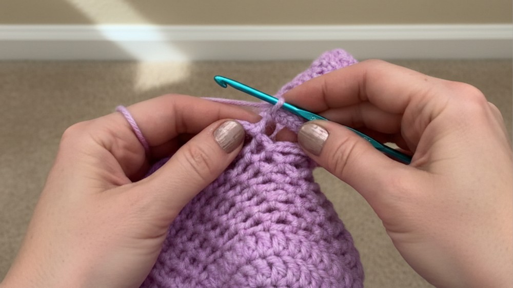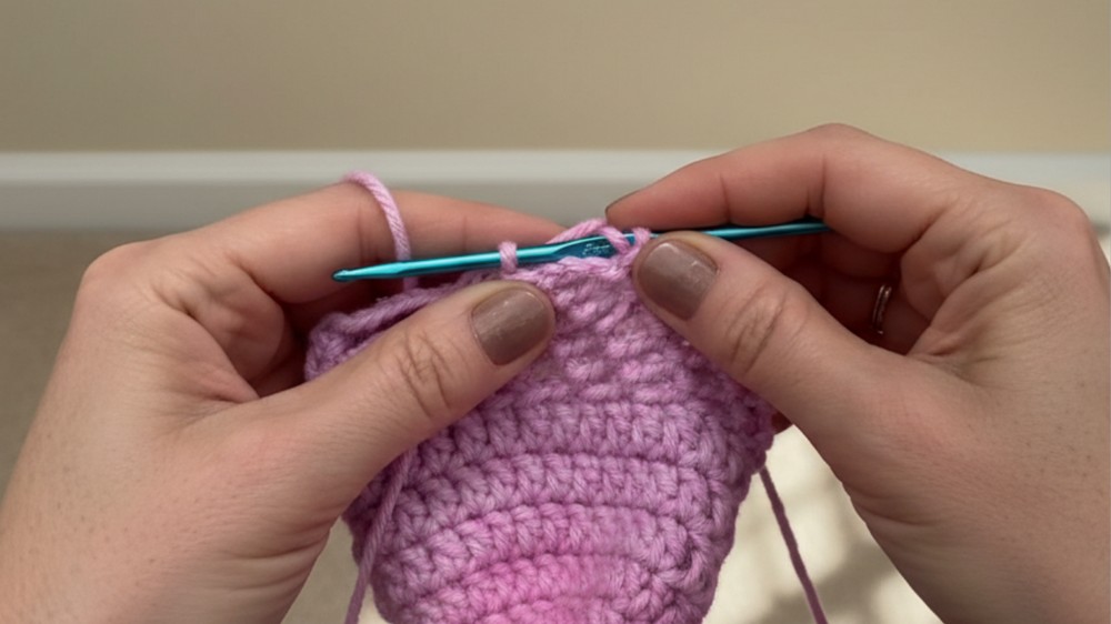 - Work a sequence of sc, hdc 2 together, and hdc 4 together in the middle stitches.