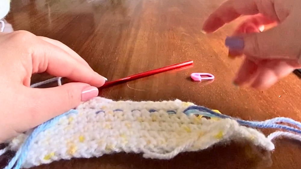 - After completing the body, count eight stitches from the edge and mark with a stitch marker.