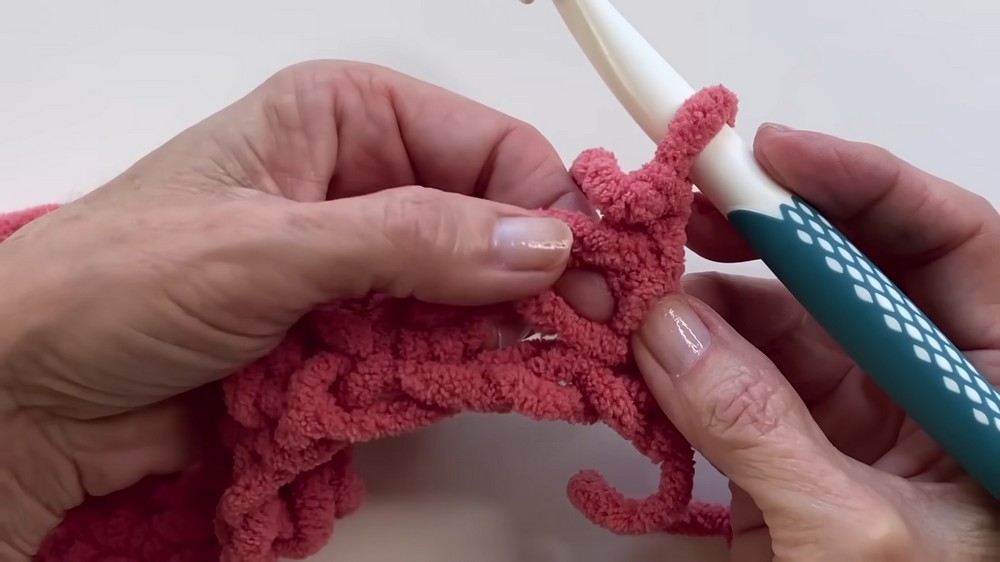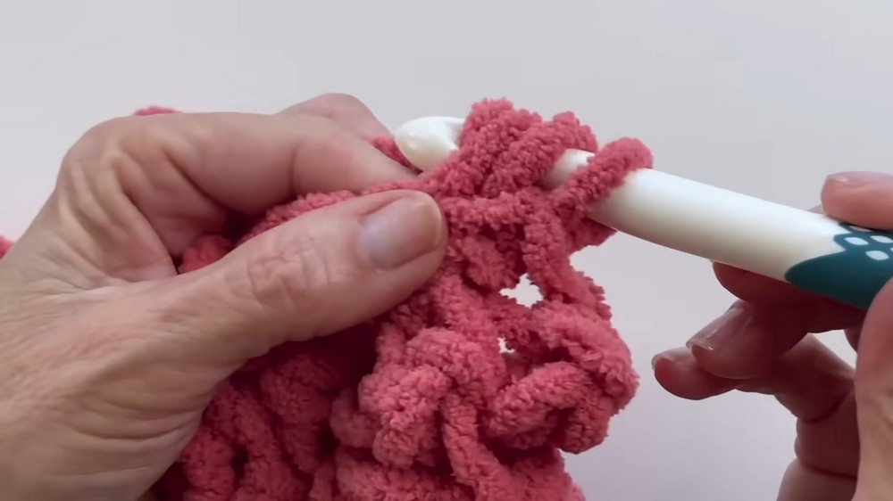 - After turning, you’ll work into the single crochets (sc) from the previous row: