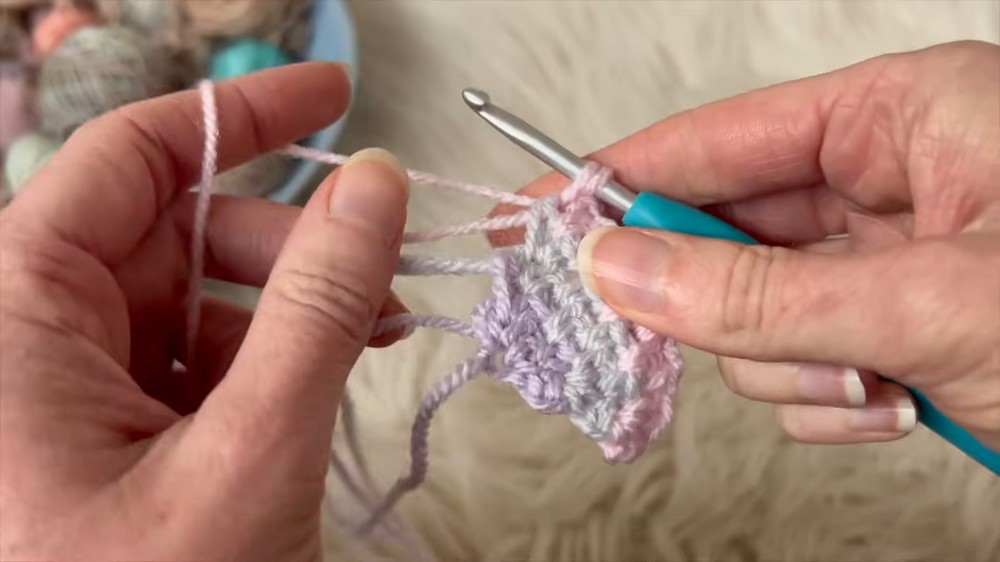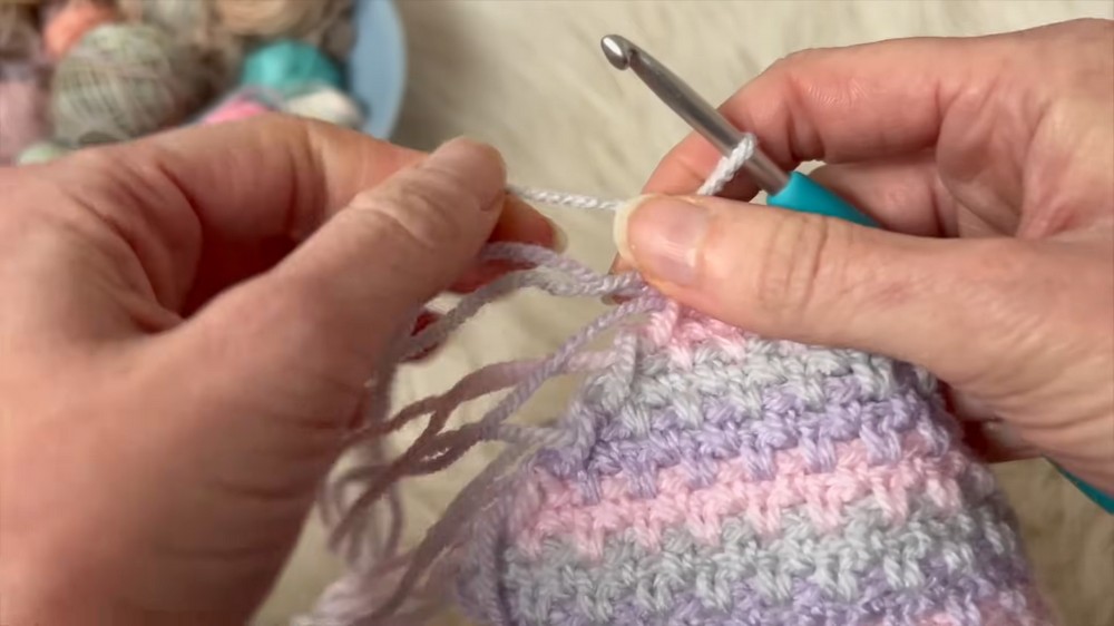 - (Optional) Change colors: Snip the yarn and pull through the new color before completing the double crochet.