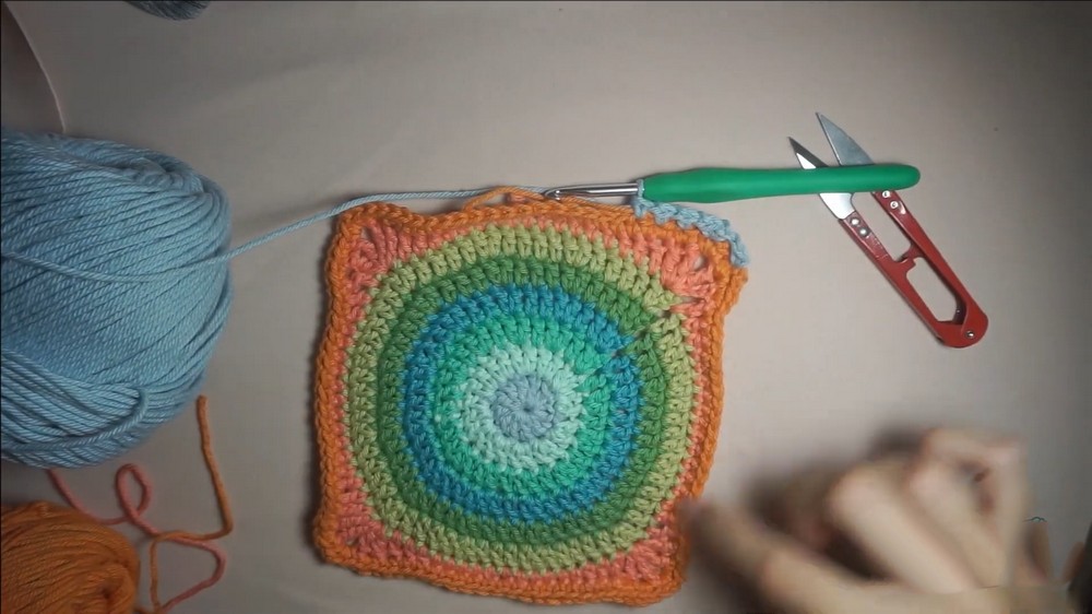 - Attach another color. Work 1 sc in each st along the edges, with 1 sc, ch 1, 1 sc in each corner.