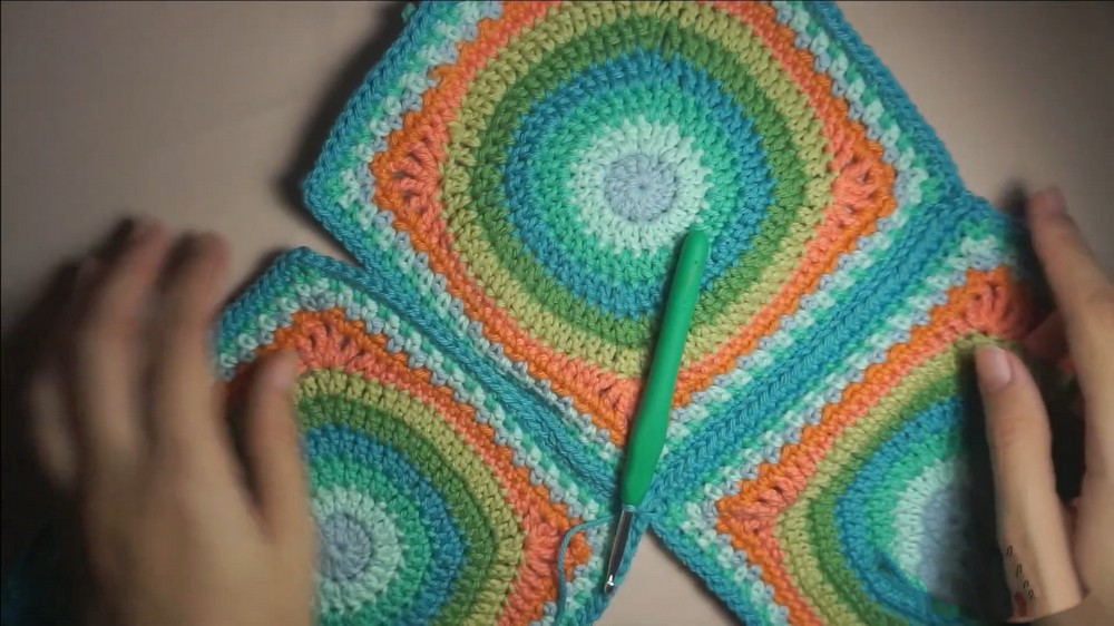 - Use a yarn needle to sew the edges together with a corresponding color of yarn OR crochet them together with sl sts using the back loops only.