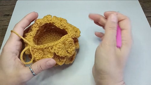 - Double crochet in the middle of the scale, chain 1, 2 double crochet on top of the previous row double crochet - repeat around.