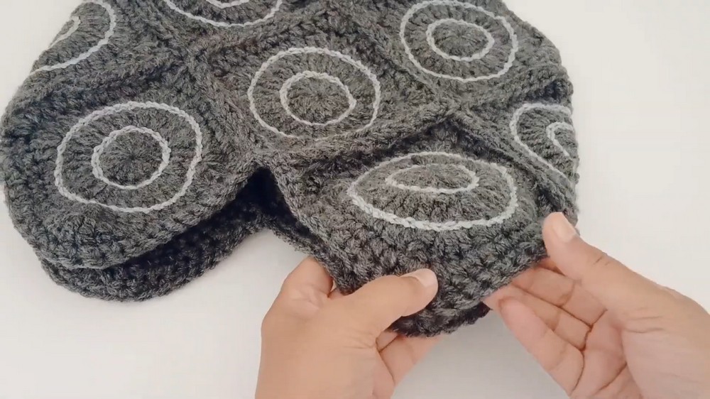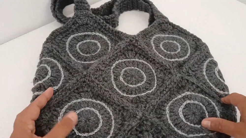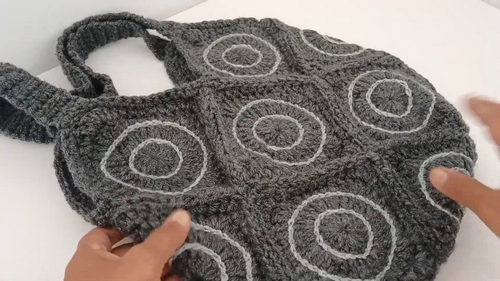 - Secure and attach the strap to the corresponding corner of a granny square on the opposite side of the bag.