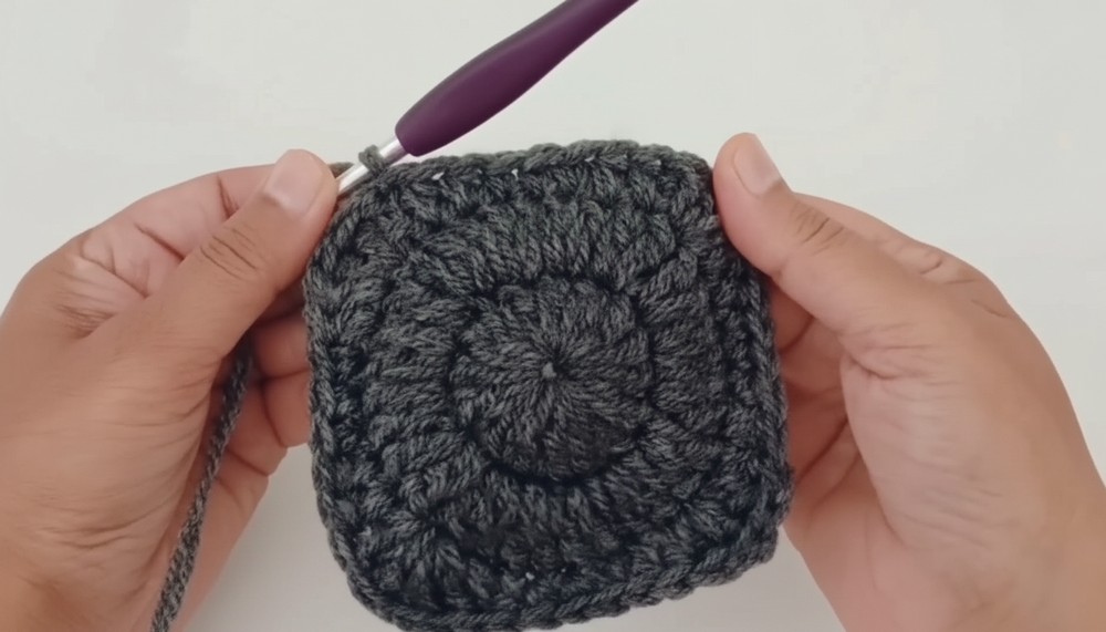 - Attach grey thread to one corner of a granny square on the top edge of the bag.