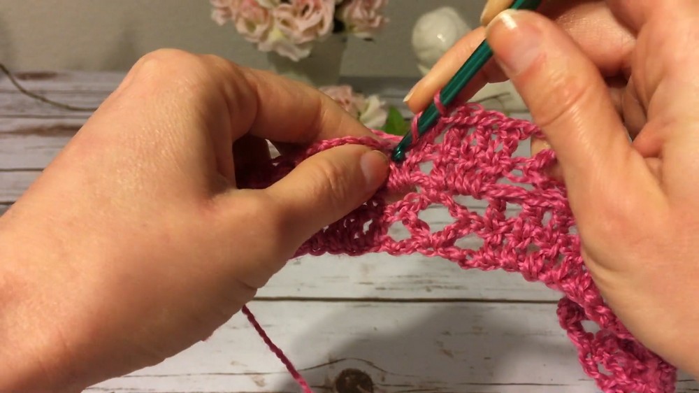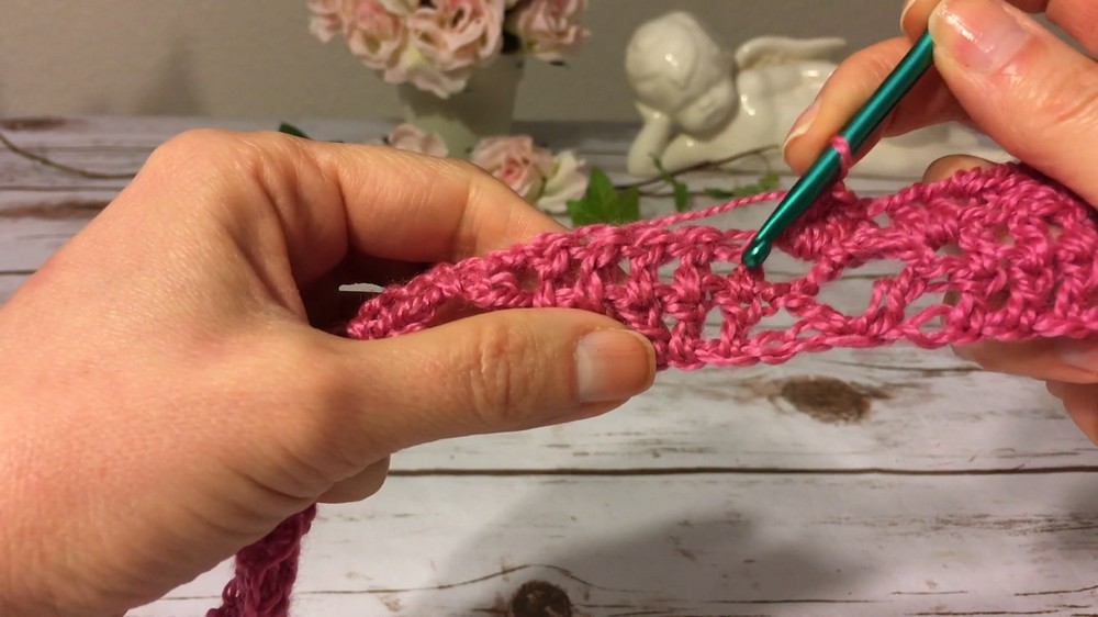 - This row continues to build upon the lace pattern and maintains the alternating clusters and spaces.