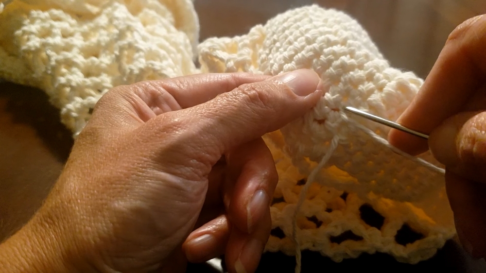 - First Rim Round: Chain 3, single crochet four times in each chain 5 loop from the previous mesh round. Skip all single crochets in lower rows.