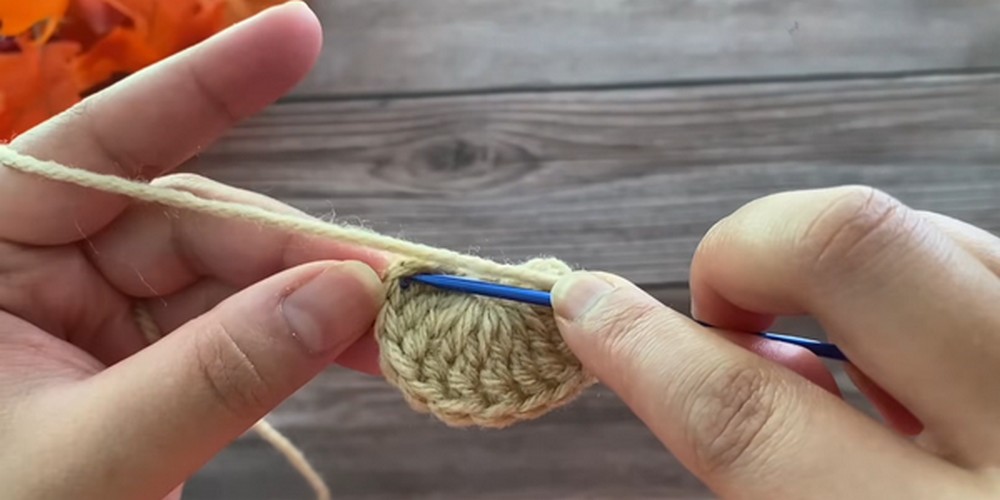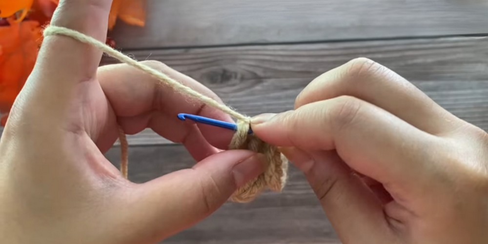 - Repeat step 9 around (total 6 sets of 2 dc each).
