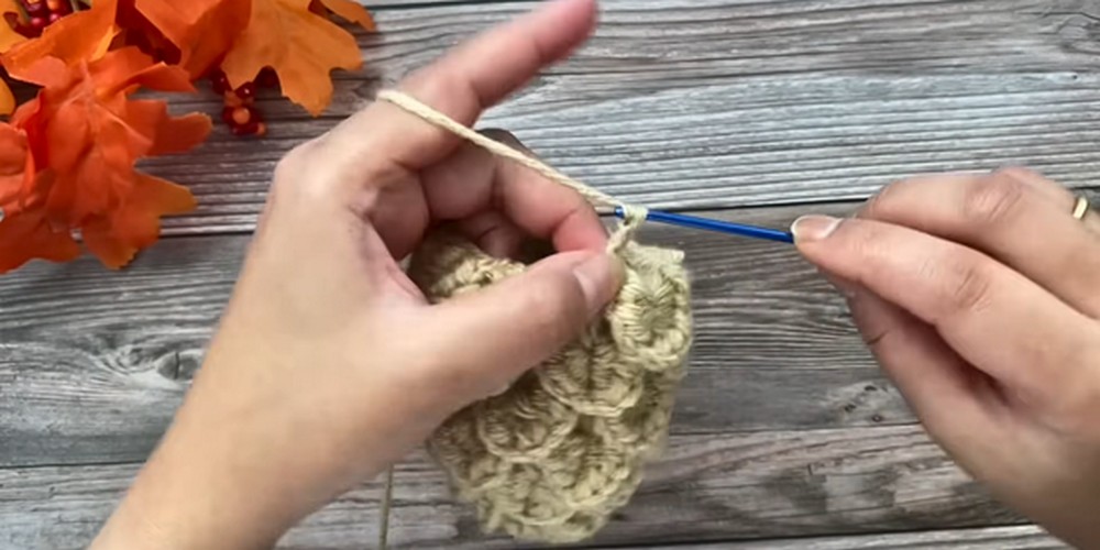 - Rotate work counterclockwise, work 5 hdc around the second dc post.