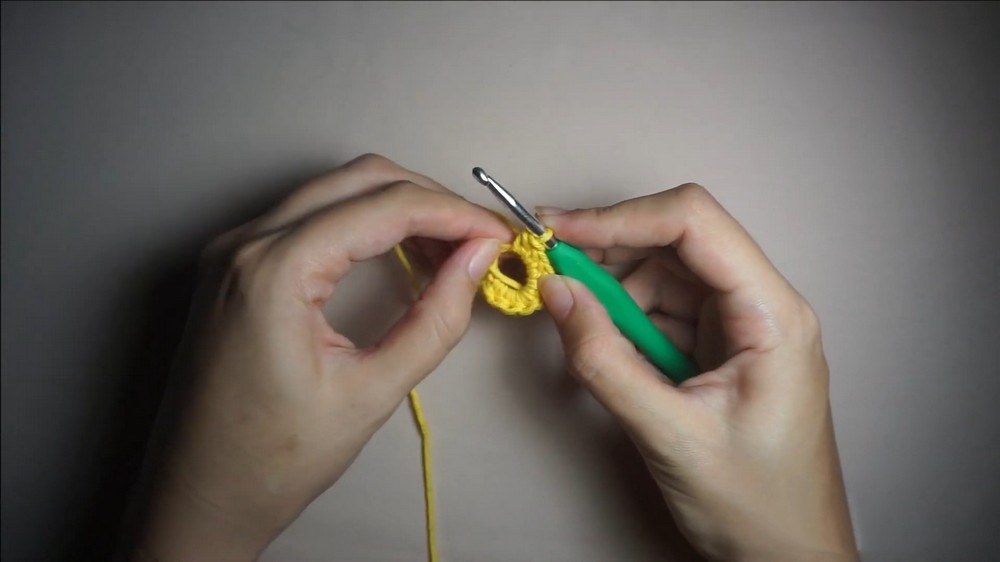 - Work 9 hdc into the ring (10 hdc total, including ch 2).