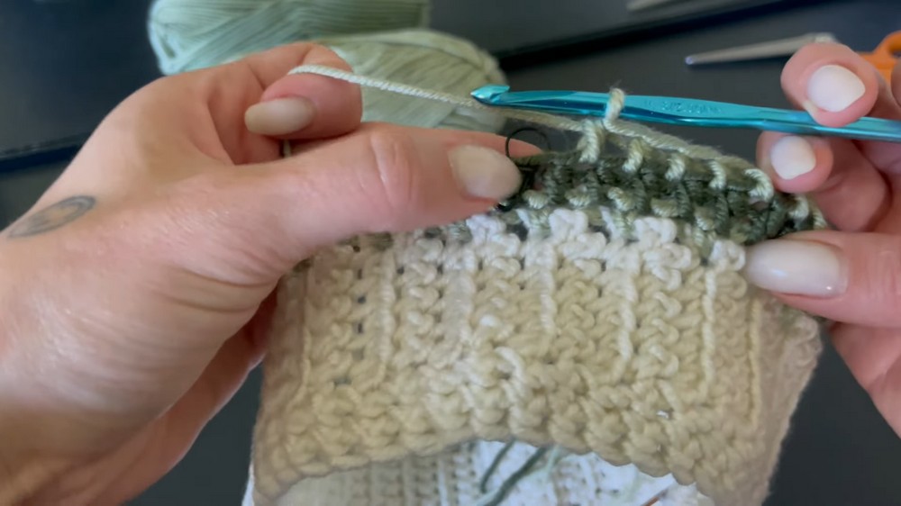 - Switch to lighter green yarn (Matcha Mondays) and begin single crochets around the waistband.