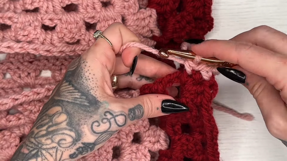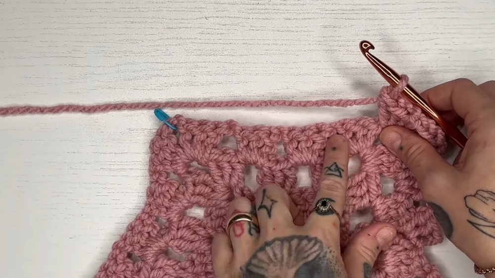 - Work granny clusters into the chain spaces, ensuring corner spaces are made with granny clusters, chain 2, and granny clusters in the same space.