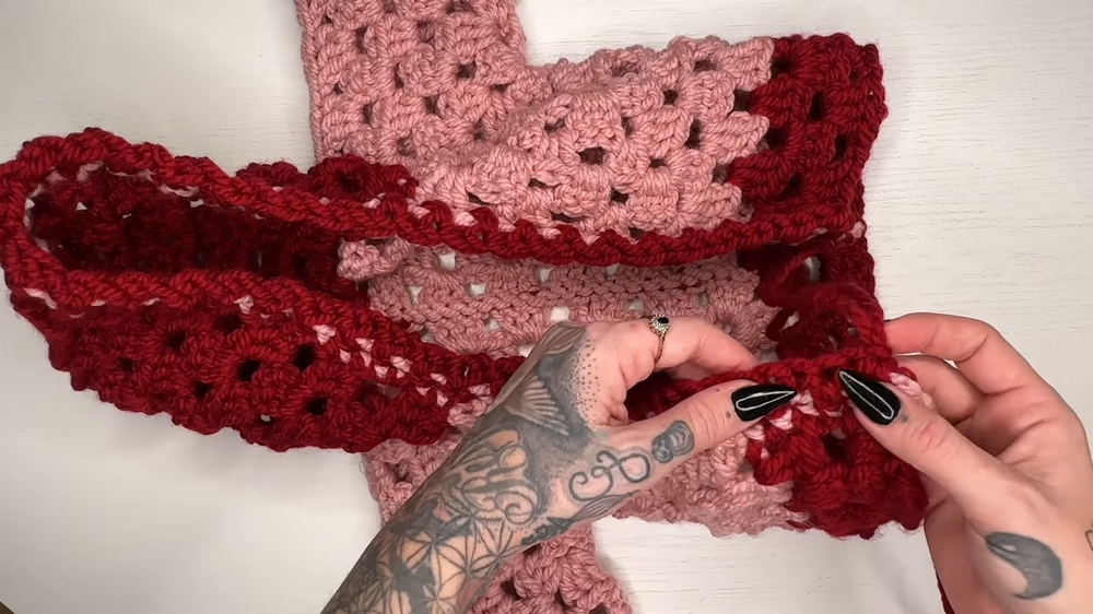 - Work granny clusters along the edge, adding a granny stripe at the back neck using a granny stitch decrease.