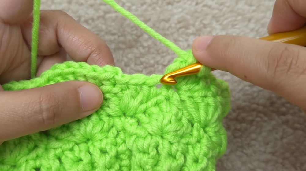 - Work 2 more DC into the same first stitch (to complete half a shell).