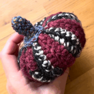 - Begin decreasing stitches until the base is small enough to close. Leave a long tail for attaching the body to the head.