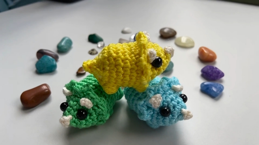 - Attach safety eyes on either side of the head, beneath the spikes.