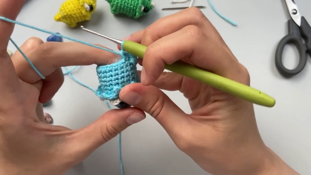 - For each leg, crochet 5 stitches, then join them together in the next round.