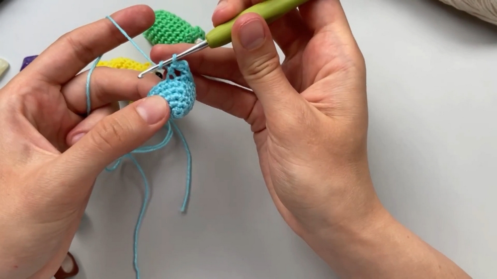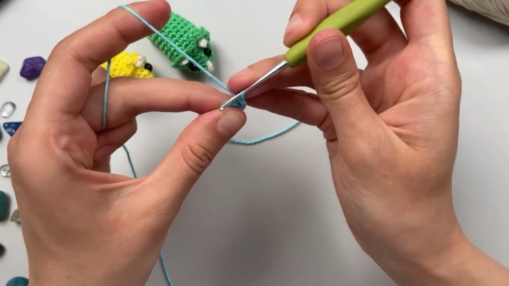 - Create 6 single crochets (SC) into the ring using mint green yarn.
