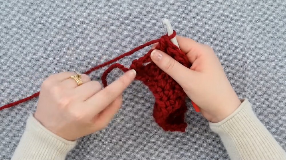- At the end of the single crochet row, ch 3. This chain will count as your first double crochet (dc) for the next row.