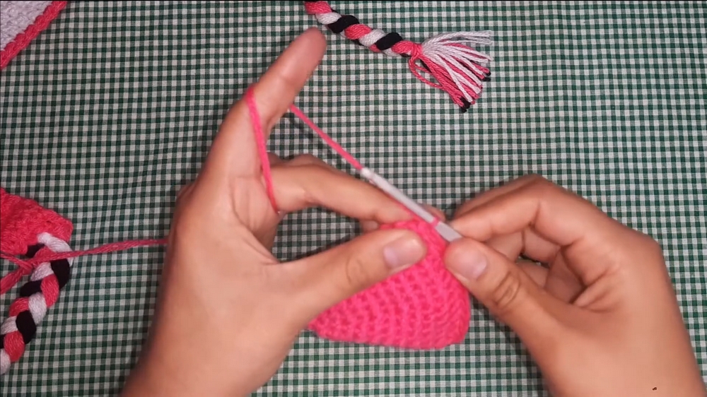 - Yarn: Fuchsia, white, and black yarn with a thickness of 2 mm.