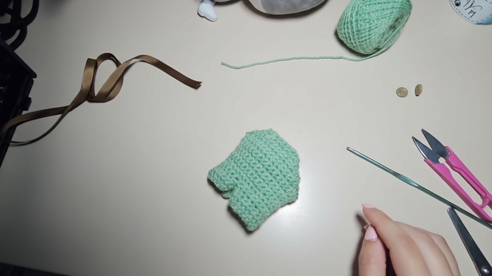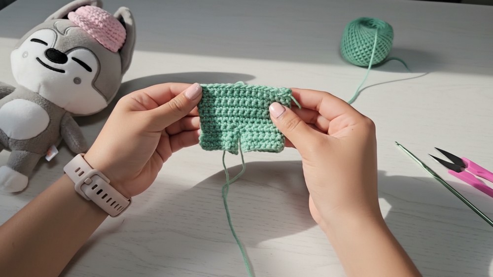 - Continue working single crochet rounds around the opening of the joined legs to create the pant body.