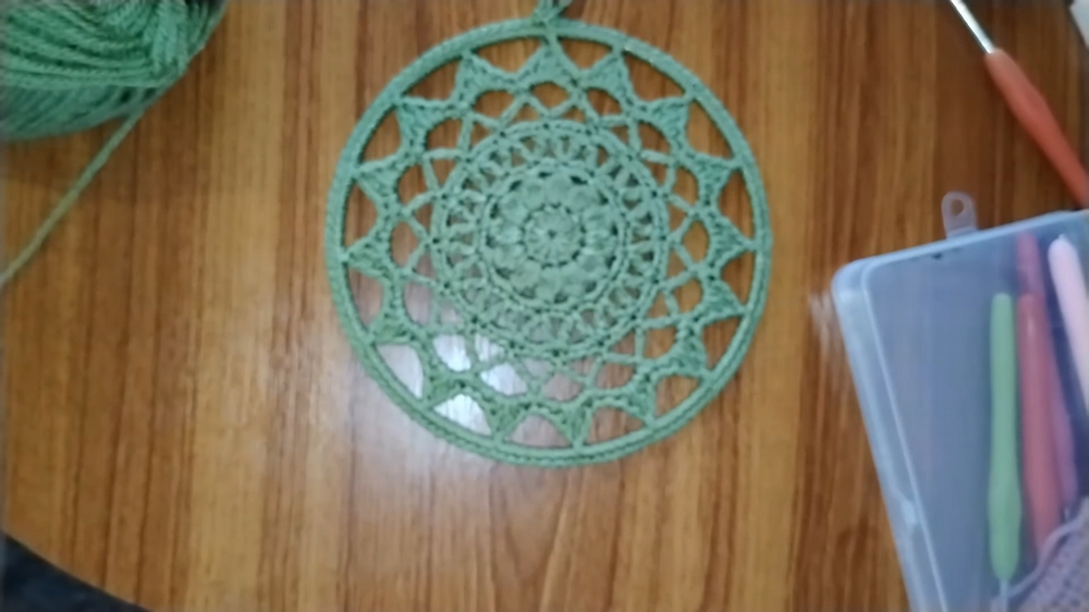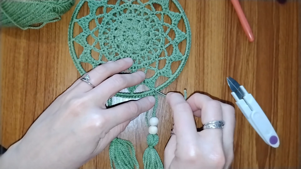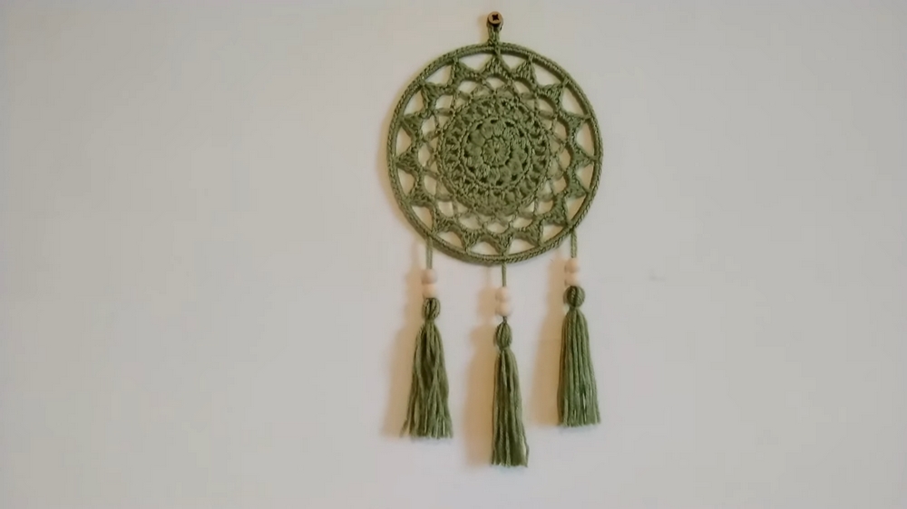 - The finished dreamcatcher features intricate lace-like crochet patterns, forming a decorative centerpiece.