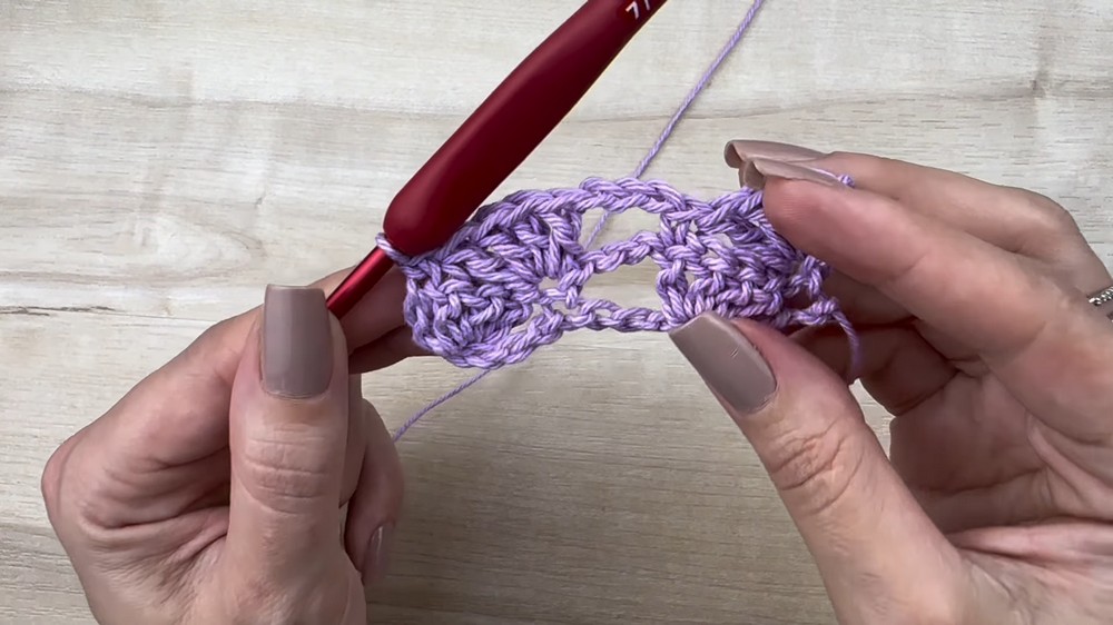 - Skip next 3 ch, sc in next ch.
