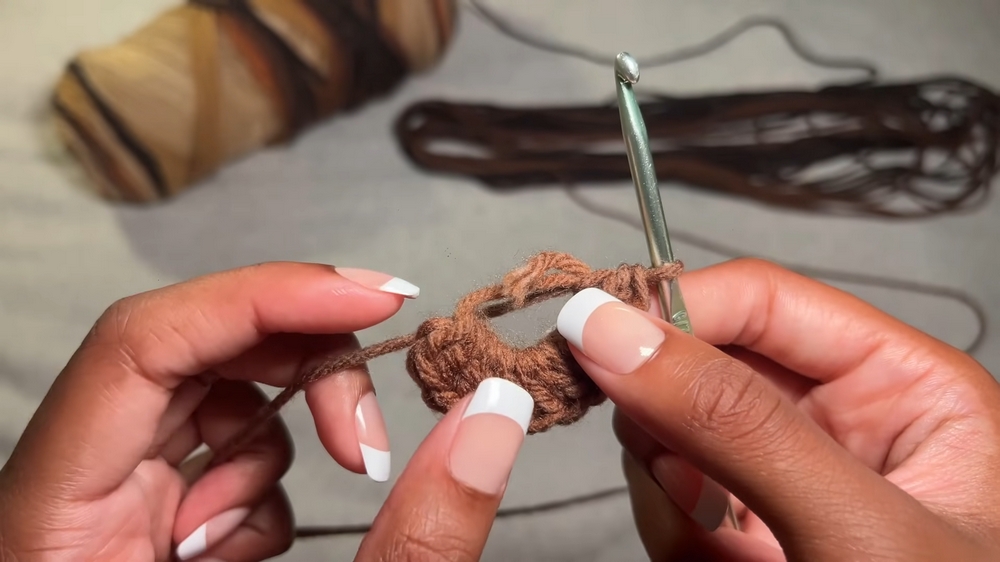 - Chain two, then double crochet into the same stitch and follow with 10 double crochet.